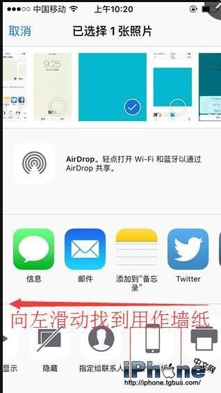 2、打開相冊,找到這張圖片,點擊左下角的分享按鈕,再選擇"用作牆紙",選擇"靜態"並"設定主屏幕",如圖:
