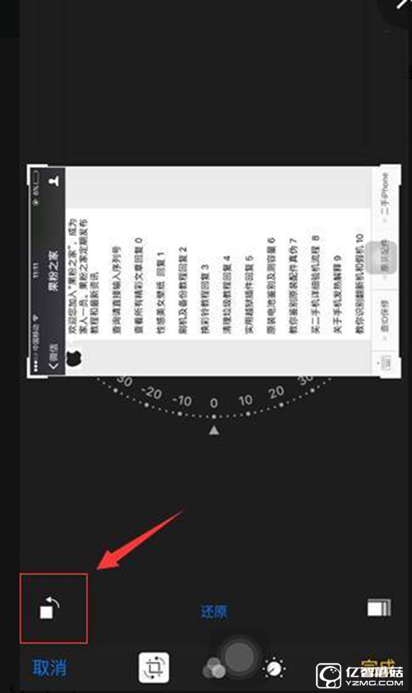 3、進入裁切模式後,再點擊左下角的“90度旋轉”圖標,最後點完成。