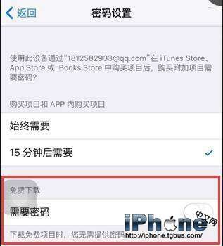 3、點擊“密碼設置”,進去後選擇"需要密碼"關閉。這樣以後您下載免費應用的時候就不再需要輸入Apple ID賬號和密碼了。說真的,我們平常下載的基本都是免費的,沒幾個人會用收費軟件,如果是收費的軟件,我們當然不介意重新驗證一下Apple ID賬號和密碼了, 安全性更高嘛。