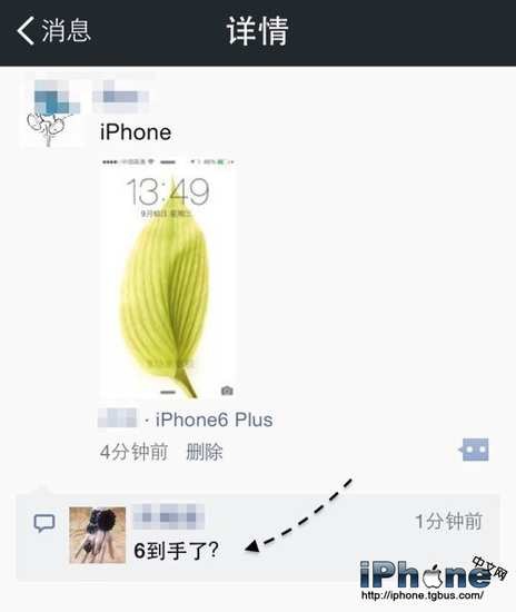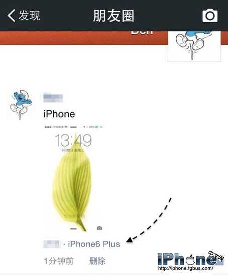 當消息發送到朋友圈之後,此時即可看到在消息下方顯示一條 iPhone6 Plus 的消息,如圖所示