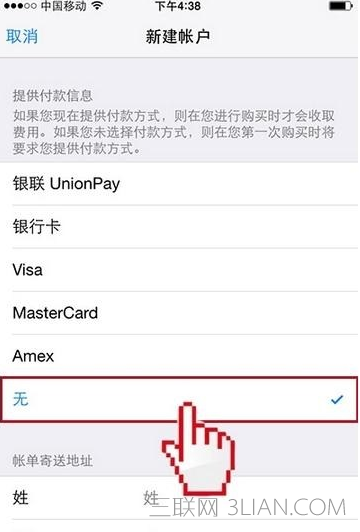8、在付款信息中,可以選擇“無”,這樣就不用綁定銀行卡和信用卡了,點擊“下一步”;