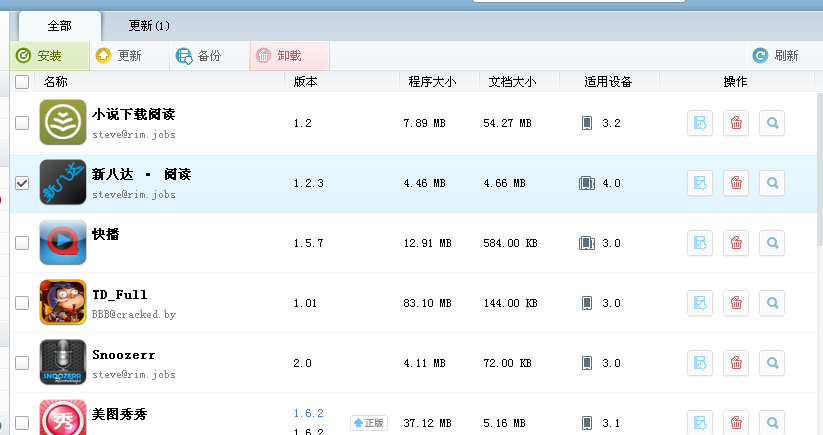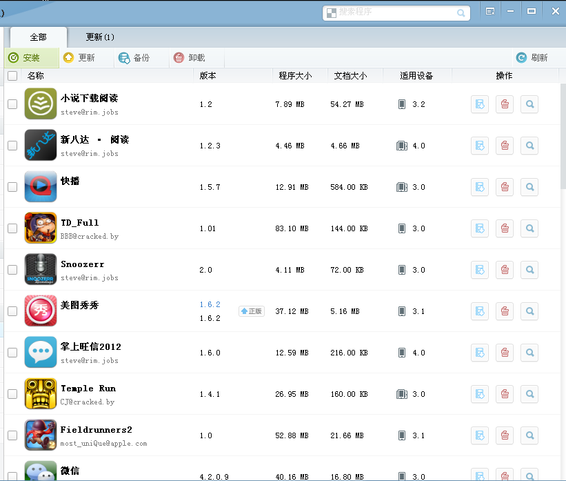 進入程序可以查看到你安裝的所有程序版本、程序大小、文檔大小、和適用的機型。選擇更新可以查看你要更新的軟件,破解版更新至破解,正版更新至正版。