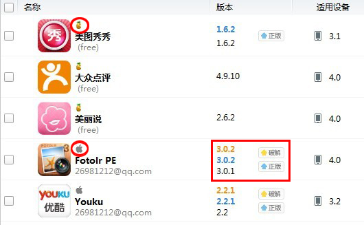 如圖,用紅圈標記出的菠蘿圖標代表破解版,蘋果圖標代表官方正版。