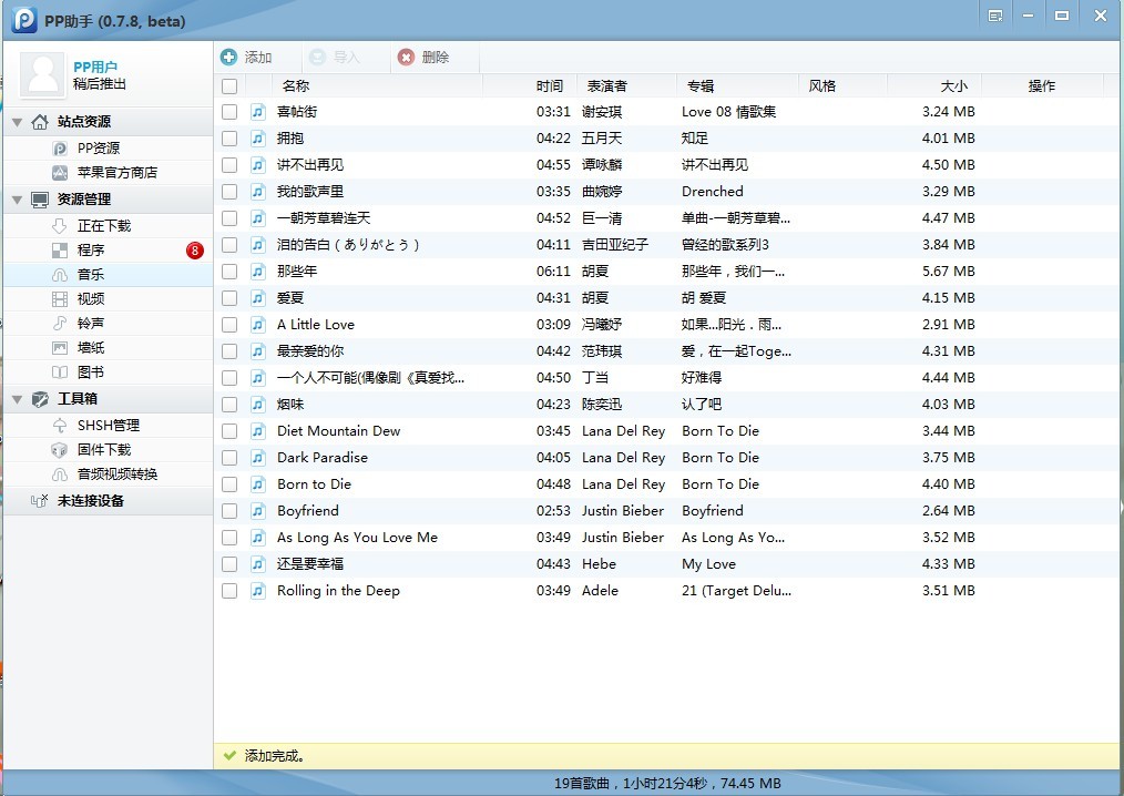 我們可以點擊“添加”按鈕,來把本地的音樂添加到PP助手中。