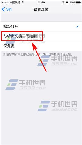 2)接著我們再點擊【語音反饋】,最後切換為【與鈴聲切換一同控制】就可以了,當手機靜音時就算呼出Siri也不會發出任何聲音。(如下圖)