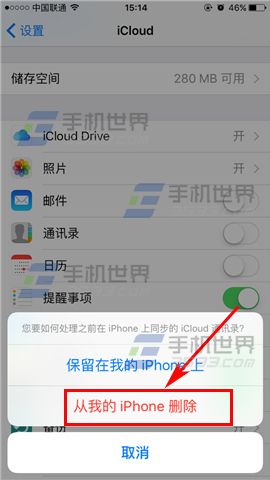 2)打開後我們再把【通訊錄】那欄右邊的橢圓往左拉關閉,最後彈出窗口後點擊【從我的iPhone刪除】就可以了。(如下圖)