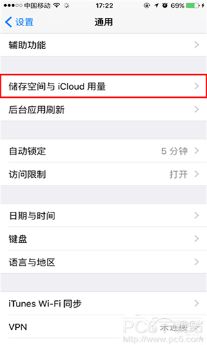2、在通用列表中,找到【儲存空間與iCloud 用量】選項,點擊打開