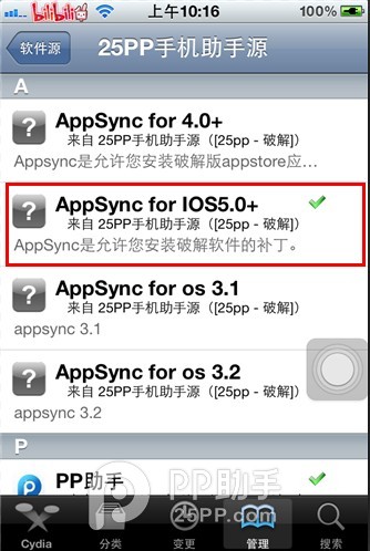 1.在手機Cydia--管理--軟件源--編輯/添加--輸入“apt.25pp.com”--添加完成--進入“25PP手機助手源”--安裝“AppSync for iOS5.0+”。