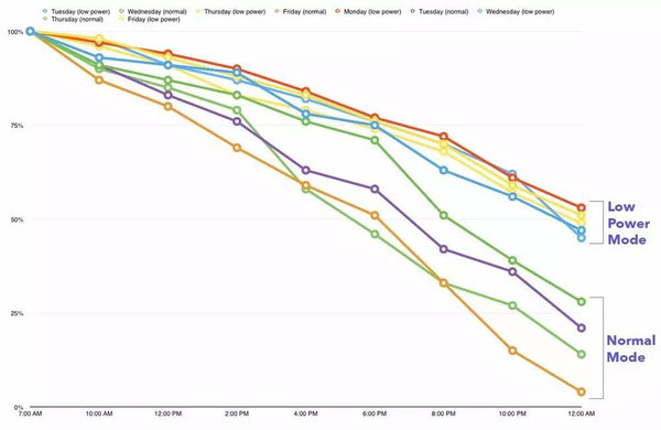 另外,如果手機的使用頻率很高的話,那麼就算開啟了低電量模式,電量還是會很快消耗,但是比沒有開啟來得更好,低電量模式下的重度使用耗電量比正常模式減少了33%。