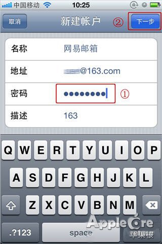 3、請填選您的郵箱名,輸入郵箱的地址、錯誤的密碼 (apple系統默認使用POP3,如果需要使用IMAP服務,則需要故意寫錯才能修改),描述可不用填寫,然後點擊“下一步”;