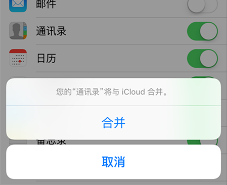 接下來,點擊“設置”——“iCloud”——“通訊錄”,在彈出的小窗口點擊“合並”,通訊錄就重新恢復到iPhone6中了。