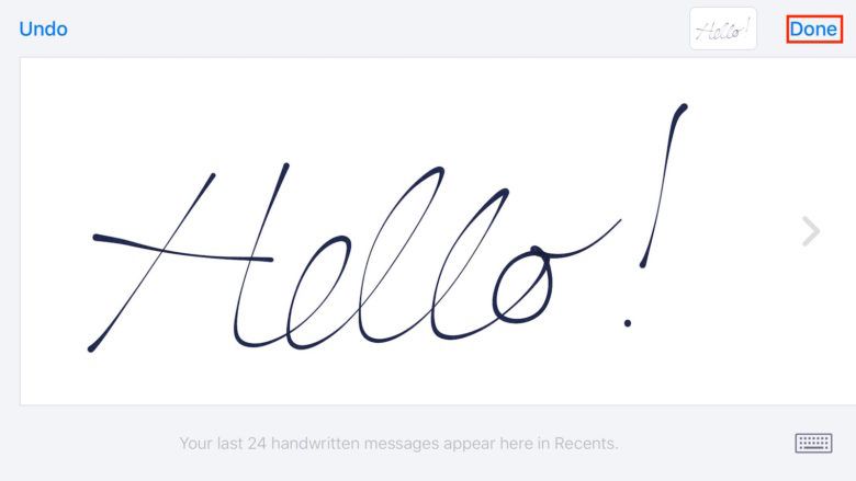 我們就可以用手指寫下短信內容,如果你需要更多的空間,可以兩根手指在屏幕上向左滑動。寫好之後,點擊右上角的“完成”按鈕。這時候,我們的手寫信息將會出現在短信對話框中,在點擊發送之前,我們還可以選擇添加一些文本信息。