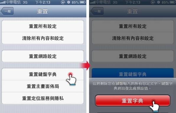 Step2 按「重置鍵盤字典」,再按「 重置字典」鈕,通過這樣簡單的處理,就能解決掉困擾用戶的中文輸入程序閃退的Bug。