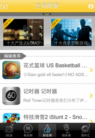 “好應用”頻道則是編輯嚴選的優質應用的推薦與評測,仍是以“應用生活”的概念為主,推薦與生活相關的應用。很多iPhone用戶都會用手機聽音樂、拍照等,相關手機應用已經深入生活中的每一個細節。值得一提的是“好應用”頻道中編輯的十大嚴選專題,以各種生活細節為選題,千挑萬選地整理出十支App推薦給用戶。