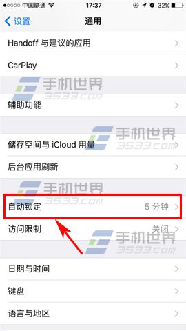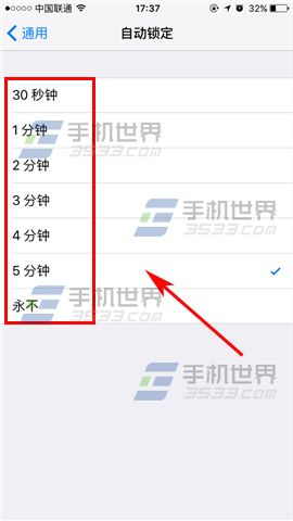 2)打開後我們再點擊【自動鎖定】,最後即可根據自己的需要進行設置鎖屏時間了。(如下圖)