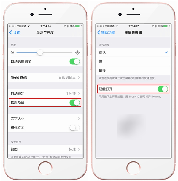 對於搭載A9、A10芯片的設備(在售的所有iPhone,包括iPhone SE、iPhone6s/Plus、iPhone7/Plus),同時開啟“顯示與亮度”中的“抬起喚醒”即可快捷點亮屏幕,配合前一個功能即可實現亮屏下輕觸解鎖,無需按壓Home鍵。