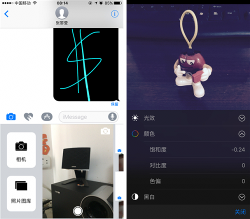 相機功能顧名思義,就是可以讓用戶直接拍攝照片或發送圖片庫中的照片給對方,透過Markup功能,可對照片進行再編輯,比如調整亮度、對比度等等;Digital Touch 這個一開始就給小編一種似曾相識的感覺,沒錯,其實就是將Apple Watch上的Digital Touch移植了過來,比如雙指長按可以打出“愛心”,單指輕點打出“煙火”等等,在手機上使用 Digital Touch 自然是比在 Apple Watch 上使用更為便利。
