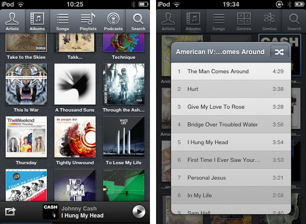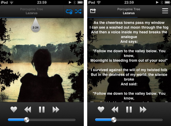 歌曲的播放界面與iTunes類似,封面專輯在中間,下面是暫停/上一首/下一首按鍵和進度條。右上角的表格圖標可以調出同張專輯的所有歌曲。