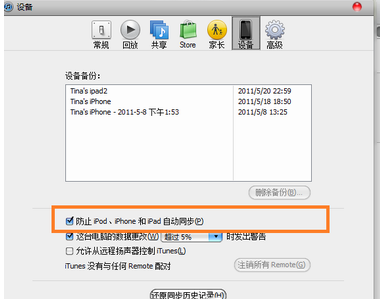 <1> 可以設置資料庫中的子菜單,有些平時沒有用到的就可以不去設置,選擇設置經常能用到的就好,比如應用程序、鈴聲、音樂、廣播等。小編個人對大家的友情建議:大家可以將設備選項裡的防止ipod、iphone和ipad自動同步打鉤。如圖所示: