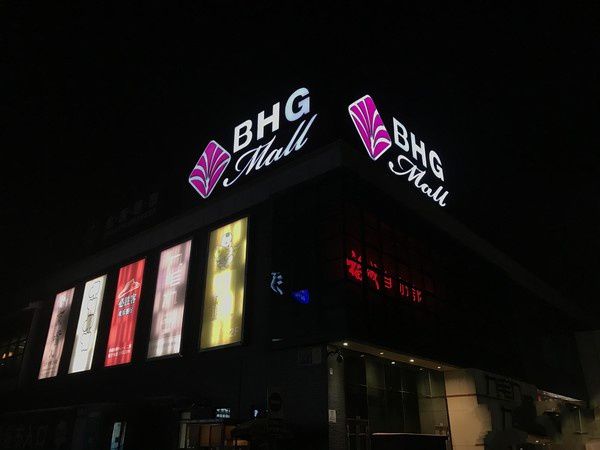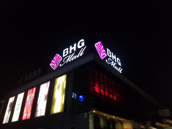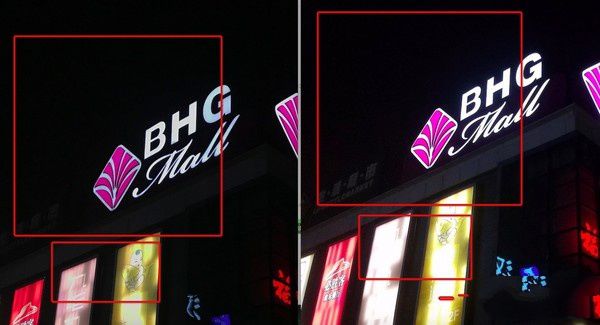 三星S7 edge的樣張一眼望去效果確實驚艷,甚至有些暗部地方相比蘋果能夠明顯可見了,如“BHG”左側的“生活超市”字樣。但問題在於,有些地方過曝,比如下圖中底部燈箱廣告的地方,iPhone 7 Plus仍然能見一些廣告內容,而S7 edge卻看不到,並且噪點要更加明顯。