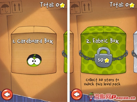 糖果怪獸(Cut the Rope)-當玩家進入或者推出賽季的時候,游戲都會非常形象的用刀割破箱子的膠帶,或者用膠帶封起箱子。