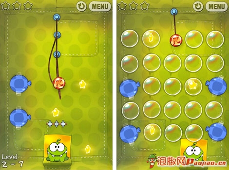 糖果怪獸(Cut the Rope)-玩家需要不停的開動自己的腦筋來切割繩子,利用氣泡、吹起裝置來將糖果送到小怪獸的嘴裡。