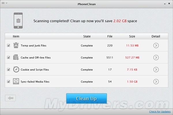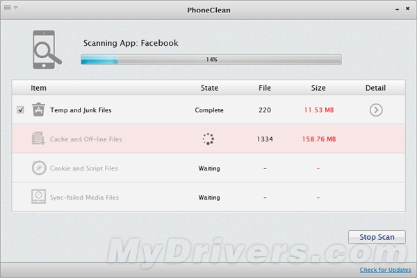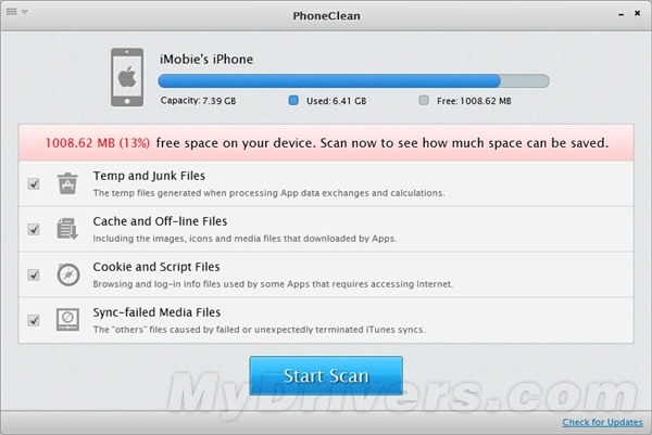 用USB數據線將iOS設備和電腦連接,Phoneclean顯示該設備的已用/可用空間,並讓你選擇想要清除的文件類別然後點擊“Start Scan”