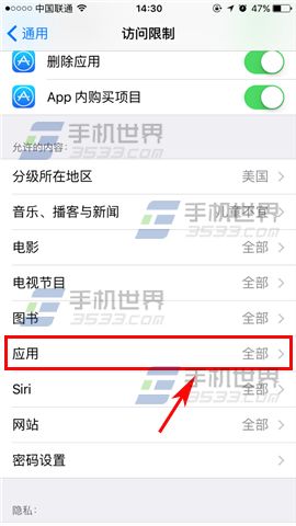 3)如果我們需要隱藏下載的應用,那麼就繼續下拉找到【應用】,隨後根據應用級別進行選擇或者直接選擇【不允許應用】即可。(如下圖)