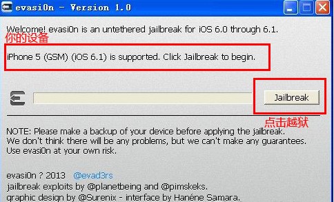 3.3 將設備連接上電腦,evasi0n會自動設別你的設備,同時evasi0n上的jailbreak圖標就變成可以點擊的,點擊即可開始越獄。這裡一定要去掉你的鎖屏密碼(如果設置了iTunes備份密碼,也請去掉)否則會報錯!