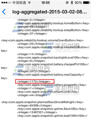 2)如果你現在身邊沒有電腦或者懶得下載軟件的話,我們可以打開手機【設置】-【隱私】-【診斷與用量】,找到log開頭並且日期距離現在最近的一欄!全選復制到備忘錄裡,然後查找出如下圖所示,裡面數字就是電池容量了!(PS:診斷與用量是系統默認開啟的,如果你的診斷與用量裡沒有log開頭文件,是因為你關閉了自動發送診斷與用量,開啟後再使用幾天手機就會出現)(如下圖)