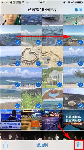 2)打開後點擊右上角的【選擇】,最後我們就可批量性選取圖片了,只需要手指向右劃一下即可快速選取,選取完後點擊右下角的【垃圾桶】刪除就可以了。(如下圖)