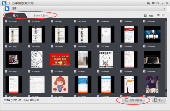 步驟五、掃描結束可以預覽到全部的照片信息,可以根據時間對照片進行篩選,選擇需要恢復的照片,點擊【恢復到電腦】將照片導出到電腦保存;還可以點擊上方的“多媒體和附件”卡項找回手機中誤刪的視頻,操作是不是非常簡單呢?
