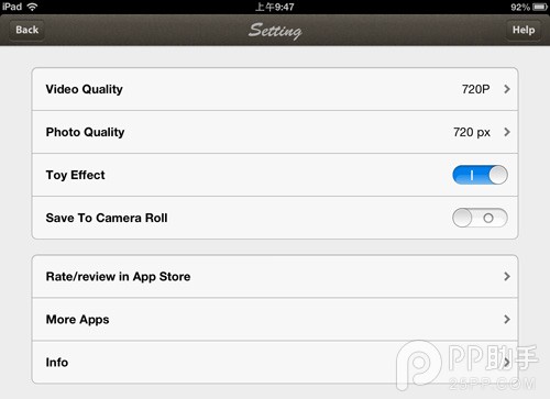 MiniatureCam支持照片分享功能,不過這是一款國外軟件,因此僅支持Facebook和Twitter。值得一提的是,無論是攝影還是攝像,在此之前用戶一定要把選項裡面的“Save to Camera Roll”的給選上(由“○”變成"|"),不然的話只能手動把照片添加到相冊裡面。