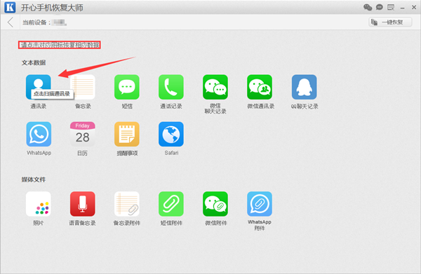 第三步:然後跳轉到數據恢復的主界面,我們可以看到開心手機恢復大師,支持恢復多種蘋果手機數據。通訊錄,短信,微信聊天記錄,備忘錄的等。我們要恢復蘋果6手機通訊錄聯系人,所以我們點擊“通訊錄”圖標。然後軟件開始掃描蘋果手機中的通訊錄數據。