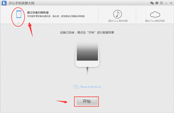 第二步:運行開心手機恢復大師,然後點擊選擇“通過設備掃描恢復”,以此恢復方式來幫助我們恢復iPhone6刪除的通訊錄。然後將我們的蘋果手機連接到電腦,然後等待開心手機恢復大師識別設備。設備完成後,顯示設備信息,然後我們點擊“開始”。