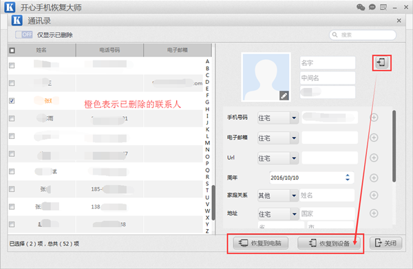 第五步:掃描出來的通訊錄以兩種顏色顯示:黑色的表示手機中還存在的聯系人,黃色的表示手機中已經刪除的通訊錄聯系人。怎麼恢復蘋果6手機號碼呢?我們在黃色區域找到我們想要恢復的聯系人,然後在對應方框前勾選,點擊“恢復到設備”即可將刪除的通訊錄聯系人恢復到設備。點擊“恢復到電腦”即可將選中的聯系人保存到電腦。
