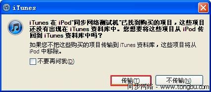 2)如果iTunes詢問是否把未出現在iTunes資料庫中的購買項目回傳到iTunes資料庫中,點擊“傳輸”。