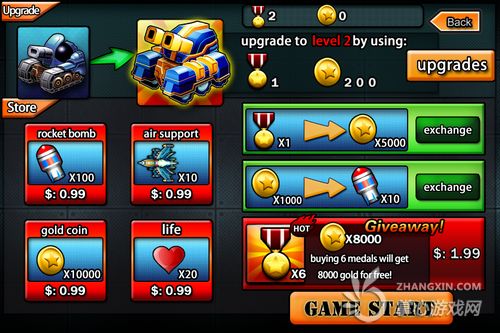 游戲在武器上的沒有過多的變化,雖然己方的坦克是可以升級的,但是升級的價錢可以說是非常昂貴啊,因為游戲中金幣的獲取量實在是太低了,一個關卡最好的時候能獲得10多金幣,以這樣的速度何時能夠升級。