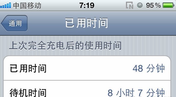 當你的iPhone的電池顯示1% ~ 5%的時候,打開設置 -> 通用 -> 用量,可以看到在最下面會顯示上次完全充電後的時間統計: