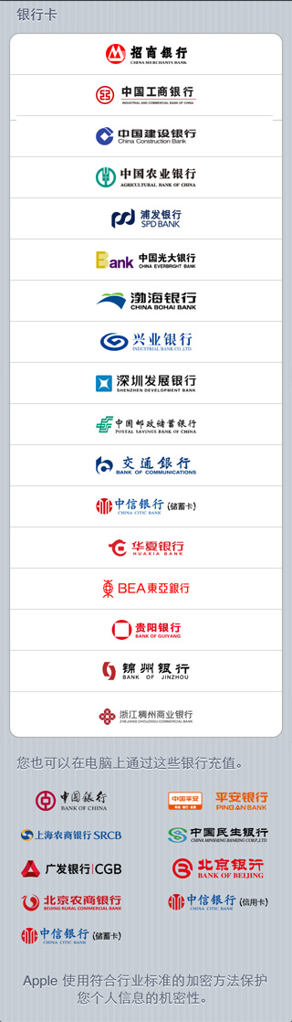 在電腦上,除了上述銀行外,還支持中國銀行、平安銀行、上海農商銀行、民生銀行、廣發銀行、北京銀行、北京農商銀行、中信銀行(信用卡及和儲蓄卡)