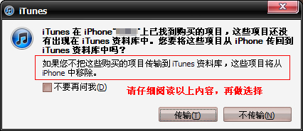 在點擊【應用】按鈕後,將彈出如下提示框,您需仔細閱讀提示框中的內容,再進行選擇。我們這裡是選擇了【傳輸】按鈕,在iTunes 資料庫中備份。