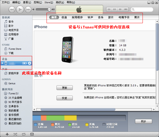 步驟5:同步應用程序。我們這邊用iPhone作為使用設備。用數據線把iPhone與電腦連接上,打開 iTunes主界面,在右邊【設備】選項下找到我們的iPhone名稱。