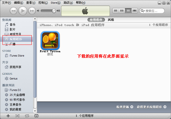 下載完成後,點擊右邊【應用程序】選項,可以查看剛下載的“水果富翁”的應用,我們還將知道此游戲適玩於iPhone、iPod touch和iPad。