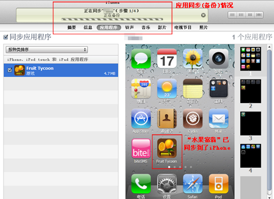 提示框對話結束後,在界面的頂部就出現了“正在同步”的信息情況,同時,從電腦上下載的“水果富翁”也同步到了我們的iPhone。