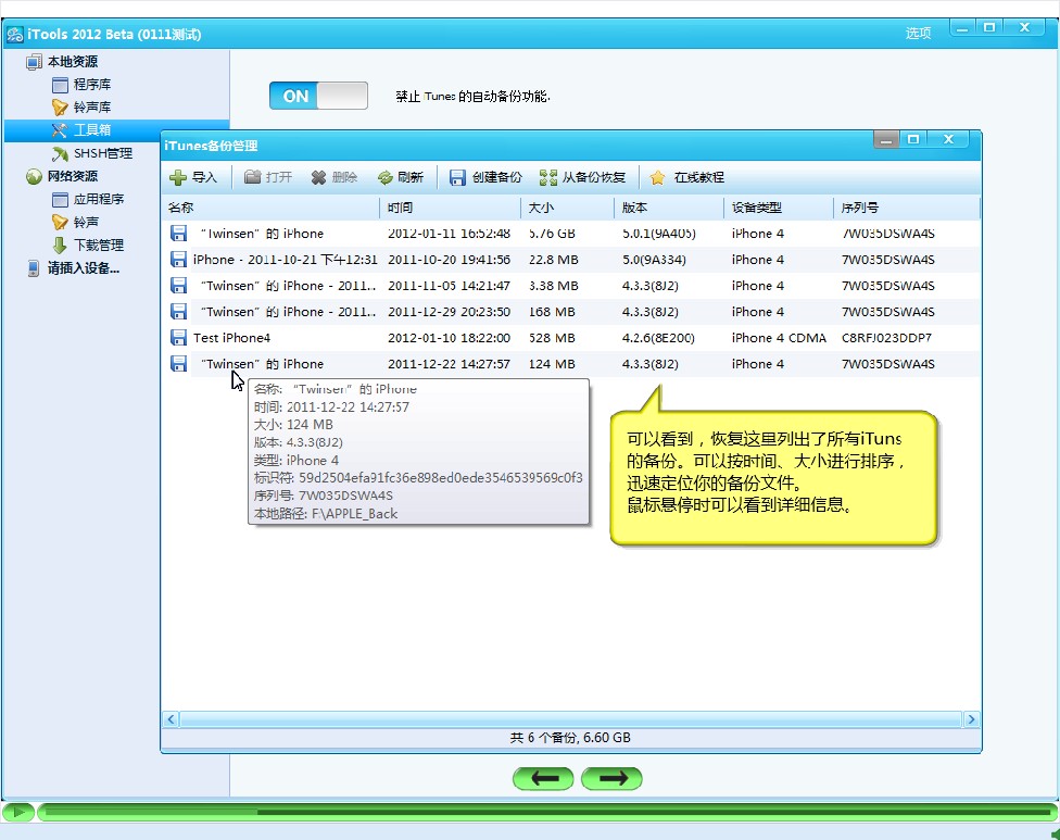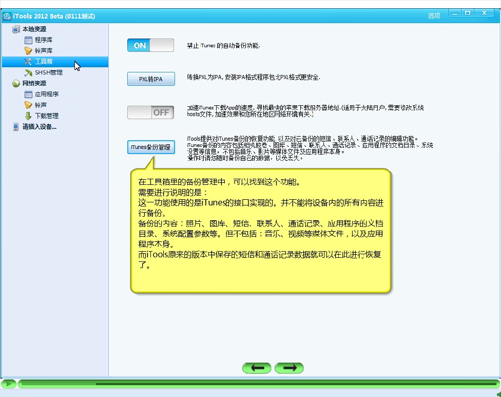 首先手機連接最新版的itools,然後在本地資源下面找到工具箱,在右邊就可以看看到iTunes備份管理。