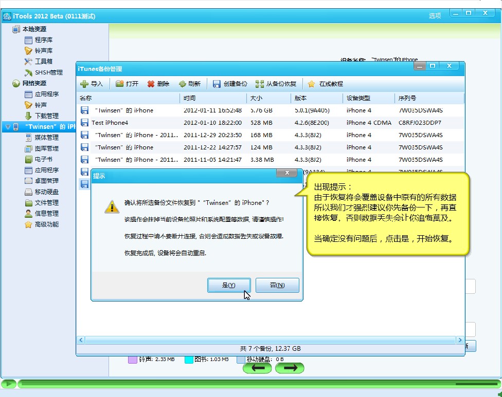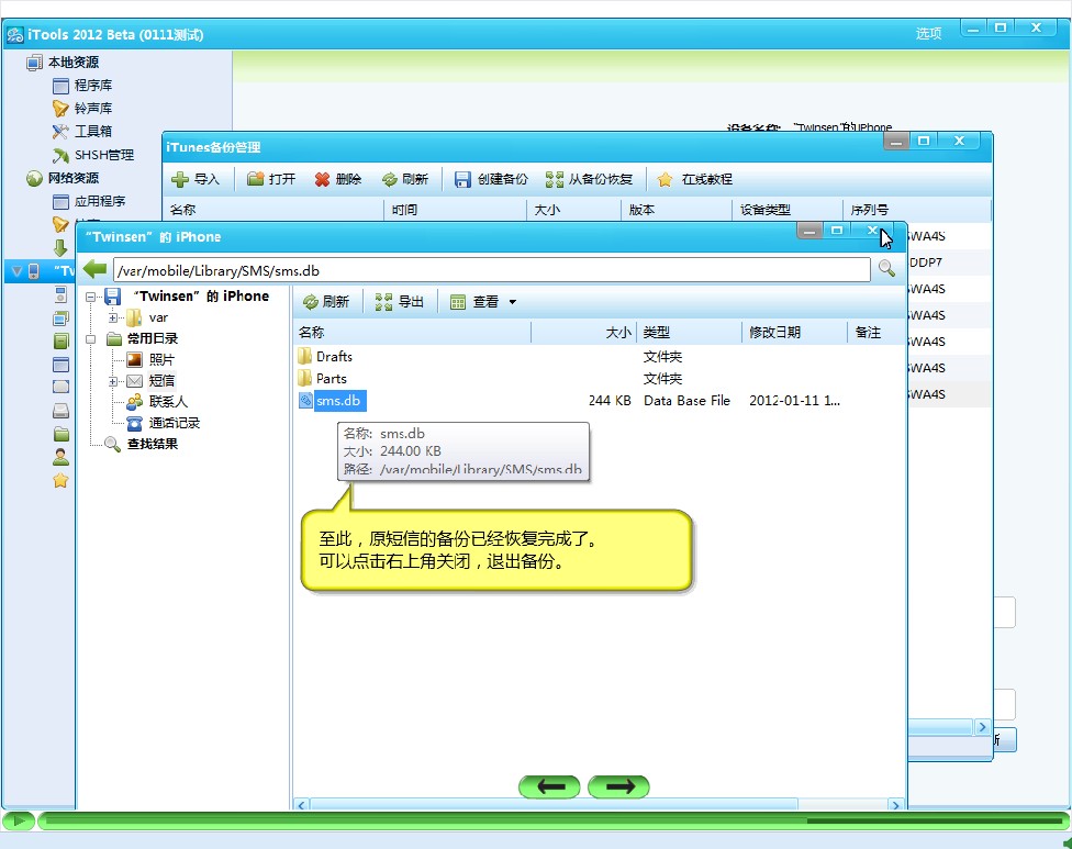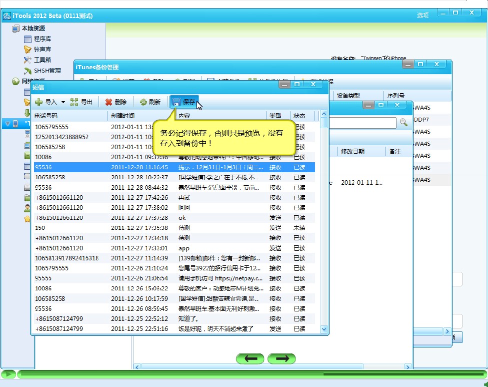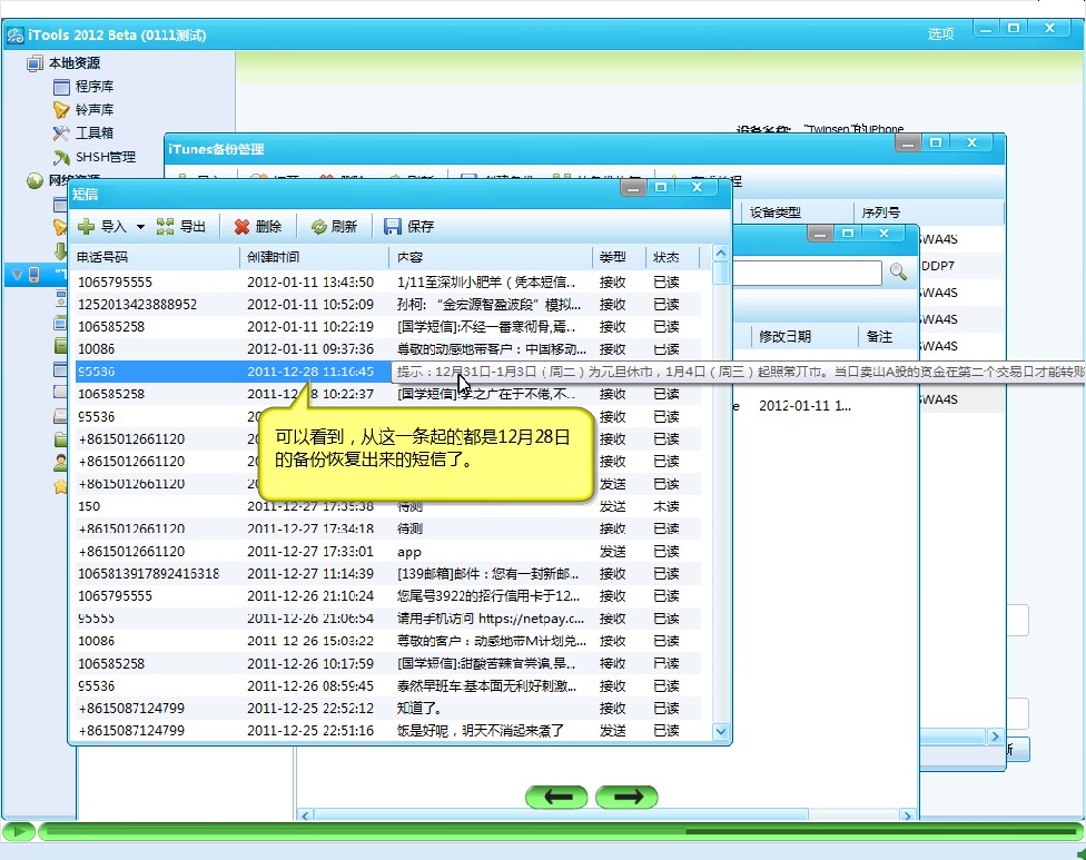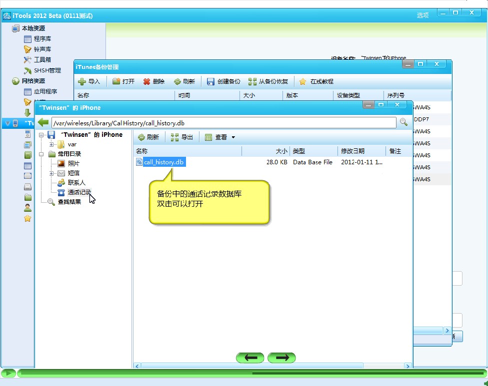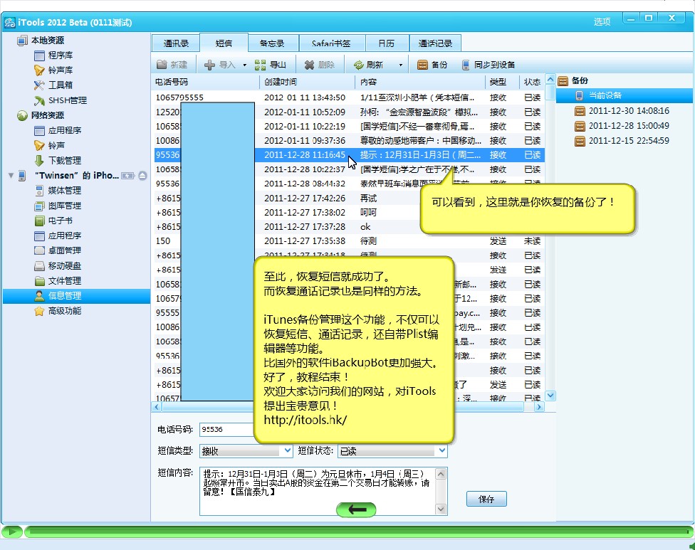 很多朋友在升級到iOS 5後無法恢復短信及通話記錄,最新版的iTools已經解決了這個問題,但由於數據安全,特准備教程一篇,請大家嚴格按教程方法進行,否則可能導致自己的設備中數據被覆蓋的問題!
