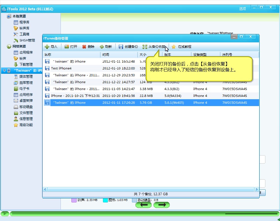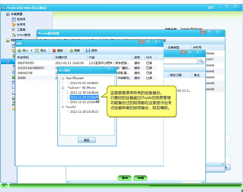 注:導入設備備份是指直接導入以前用iTools短信備份功能的備份信息文檔。