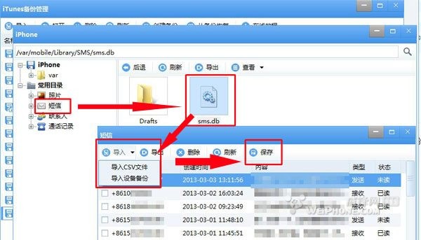 第二步,選擇備份文件。備份完成後,鼠標雙擊打開新的備份,點擊【短信】,打開【sms.db】文檔,點擊【導入】,選擇短信備份文件的導入形式“CSV文件或設備備份”,點擊【保存】即可。