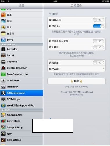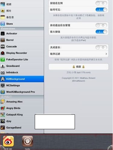 1.首先打開cydia搜索Killbackground下載安裝(小編我下載的是178源的,也有漢化補丁,可以一起下載)下載完成後打開設置-Killbackground