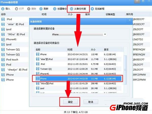 注:恢復前iPhone一定要有足夠的內存,否則會恢復失敗哦。所需內存可在選擇恢復備份列表欄查看。
